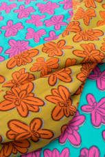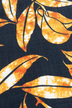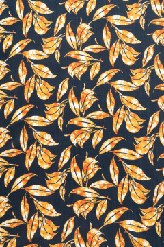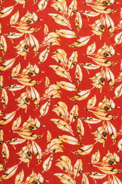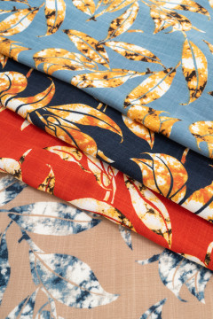 Lehtikuvioinen hyvinlaskeutuva viskoosikangas, joka sopii hyvinvaatetukseen, esimerkiksi mekkoihin ja paitoihin.