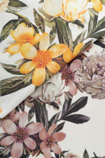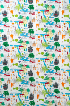 Merja Palinin suunnittelama Akaa -kuosi painettuna luomupuuvilltrikoolle. Trikoo sopii hyvin monenlaiseen tarkoitukseen, esimerkiksi paitoihin, legginseihin, mekkoihin ja tunikoihin, sekä pipoihin ja pantoihin.