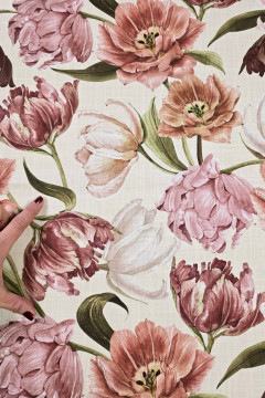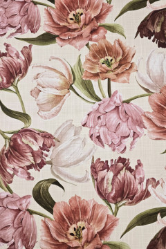 Kauniilla kukkateemaisella kuosilla painettu puuvillakangas soveltuu hyvin mm. monipuoliseen kodintekstiilien valmistukseen.