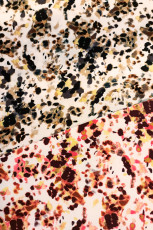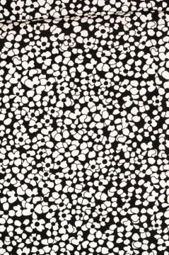 Kauniisti laskeutuva ja kevyt valkopohjainen viskoosikangas, joka sopii hyvin esimerkiksi vaate- ja asusteompeluun.