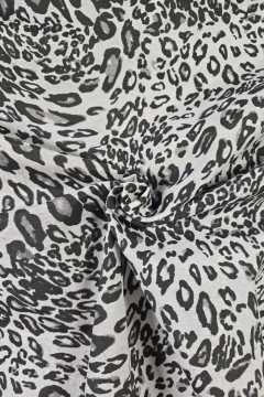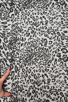 Puuvillapolyesterikankaalle painettu harmaa leobardikuvio sopii sekä vaate- että asustevalmistukseen sekä sisustukseen ja somistukseen.