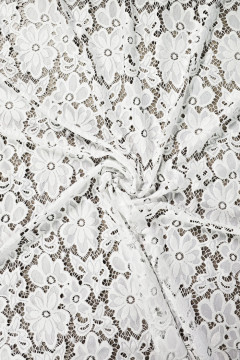 Brodeeratunomainen kaunis pitsikangas, joka joustaa loimen suuntaan ja soveltuu hyvin erilaisten vaatteiden ja asujen valmistukseen.