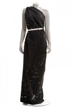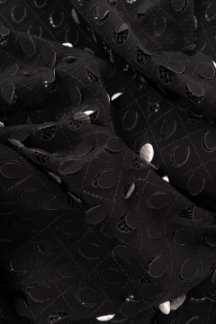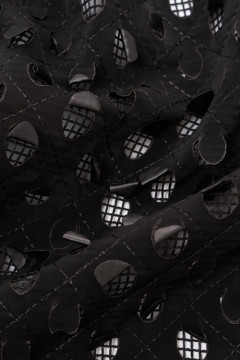 Näyttävä kolmiuloitteinen kangas. Pohja on kevyttä verkkoa ja päällä olevaan kankaaseen on leikattu suomumainen kuvio, josta vilkkuu metallinhohtoiset värit.