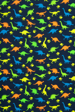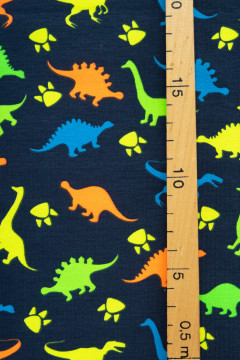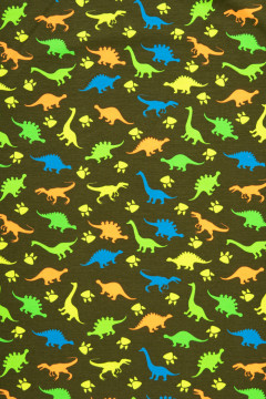 Puuvillatrikoo värikkäällä dinosauruskuosilla. Sopii hyvin monenlaiseen tarkoitukseen, esimerkiksi paitoihin, legginseihin, mekkoihin ja tunikoihin, sekä pipoihin ja pantoihin.
