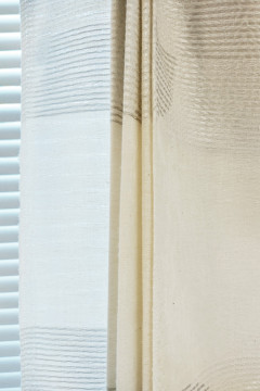 Hyvin laskeutuva, hieman läpikuultava ja kudonnalla raidoitettu verhokangas. Luonnonvalkoisen raidan leveys on noin 15cm ja vaaleanharmaan sävyisen raidan korkeus noin 12cm. Soveltuu hyvin mm. somistus-, lavastus- ja verhokäyttöön.