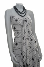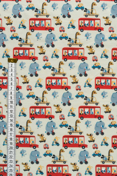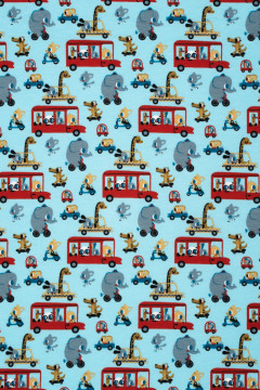 Puuvillatrikoo, jonka leikkisässä kuosissa muun muassa norsut ja kirahvit liikkuvat erilaisilla kulkuneuvoilla. Sopii hyvin monenlaiseen tarkoitukseen, esimerkiksi paitoihin, legginseihin, mekkoihin ja tunikoihin, sekä pipoihin ja pantoihin.