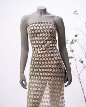 Kaunis, aavistuksen kiiltäväpintainen pitsikangas, joka sopii esimerkiksi esiintymis- ja juhla-asuihin sekä niiden yksityiskohtiin.