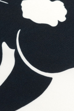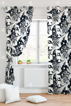 Kauniisti laskeutuva mustavalkoinen verhokangas.