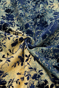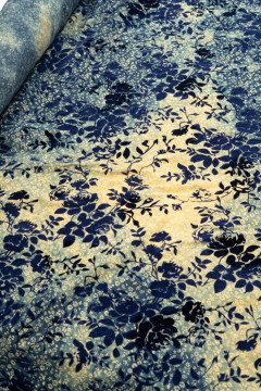 Ohuehko pikkukukkapainettu farkun tyylinen kangas, jonka pinnassa on flokkipainettua samettipintaista kukkaköynnöskuviointia. Sopii hyvin monipuoliseen vaatetus- ja asustekäyttöön sekä yksityiskohtien viimeistelyyn.