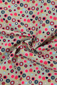 Kevyt puuvillapopliinikangas soveltuu hyvin mm. tilkkutöihin tai keveiden puseroiden ja mekkojen valmistukseen. Kuvioiden halkaisija on noin 10mm.