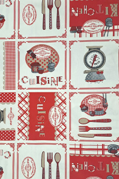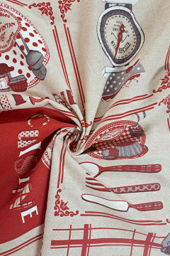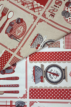 Keittiöaiheinen kuosi henkii vanhaa aikaa, ja tuplaleveä puuvillapolyesterikangas sopii moneen kodintekstiiliin, verhoihin ja tyynyihin, sekä esimerkiksi essuihin.