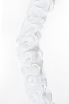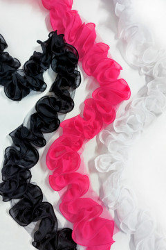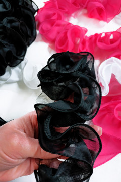 Muhkea ja näyttävä frillanauha asujen somistukseen ja viimeistelyyn. Frillanauhan pohjana on noin 8cm leveä pehmeä tyllinauha, jonka päälle frilla on ommeltu noin 4cm levyiseen s-kuvionmukaiseen mutkitteluun. Frilla avautuu noin 8cm leveäksi ja sen yläreunassa kulkee ompeleen sisällä siimat pitämässä frillaa muodossa.