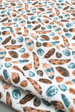 Tuplaleveä puuvillasekoite, jonka kuosissa on pieniä sulkia. Sopii hyvin erislaisiin sisustustekstiileihin.