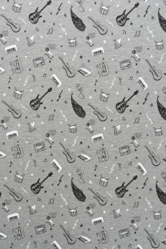 College, jonka kuosissa on erilaisia soittimia. Sopii hyvin esimerkiksi paitoihin, housuihin, haalareihin, tunikoihin sekä huppareihin.