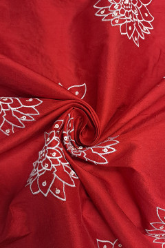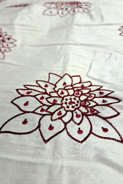 Silkki, johon on kirjailtu kukkakuvioita sekä ommeltu paljetteja. Sopii hyvin juhlapukeutumiseen, kuten mekkoihin ja jakkupukuihin.