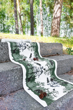 Kaukametsä -liina on 45cm leveä liinakangas, joka toimii upeasti niin kattauksissa kuin vaikkapa saunaliinoina. Liinakankaan reunat on valmiiksi huoliteltu ja se myydään rullilta.