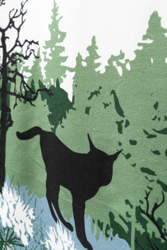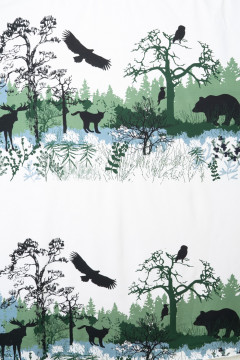 Kaukametsä -kuosin harmoninen aarniometsän siluetti on painettu joustocollegelle 110cm raporttikorkeuden välein, joka riittää hyvin esimerkiksi collegepaidan tai tunikan ompelemiseen.