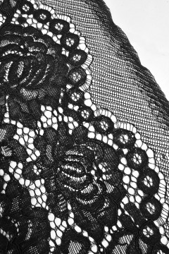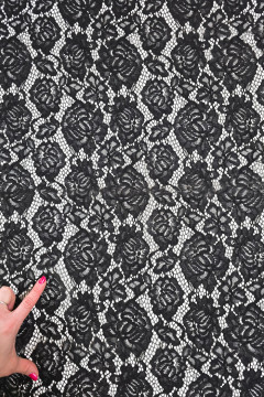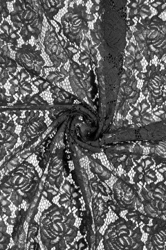 Tyylikäs musta pitsikangas, joka soveltuu hyvin mm. vaatteiden ja asujen valmistukseen sekä somistukseen.