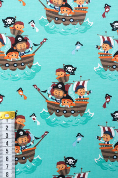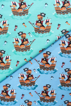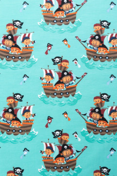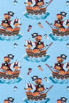 Puuvillatrikoo, jonka leikkisässä kuosissa seikkailee merirosvolaivoja miehistöineen. Sopii hyvin monenlaiseen tarkoitukseen, esimerkiksi paitoihin, legginseihin, mekkoihin ja tunikoihin, sekä pipoihin ja pantoihin.