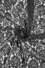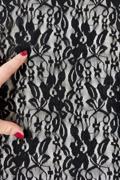 Musta, joka suuntaan joustava pitsikangas, joka soveltuu monipuoliseen vaatteiden ja asujen valmistukseen sekä somistekäyttöön.