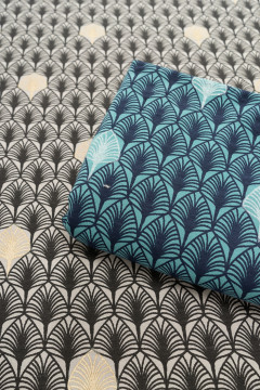 Trikoo, jossa on art deco henkinen viuhkakuvio, jossa on mukana hieman kultaista ja hopeaa. Sopii hyvin esimerkiksi mekkoihin, paitoihin, tunikoihin ja legginseihin, sekä pipoihin ja pantoihin.