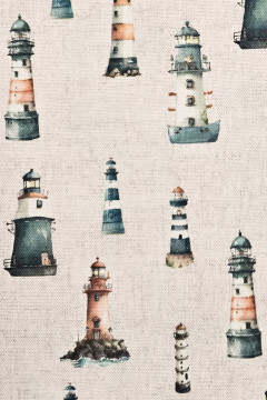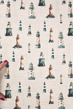 Vaalean hiekanvärisellä pohjalla oleva majakoilla kuvitettu yleispuuvillakangas soveltuu sekä vaate- että sisustuskäyttöön. Tästä syntyvät vaikkapa verhot veneisiin, liinat ja patalaput mökeille tai rentoja paitamekkoja.