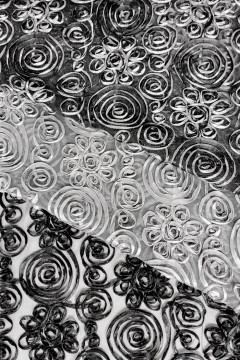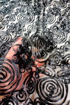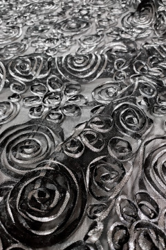 Mesh-pohjainen näyttävä kangas, jonka hohtava kuviointi on ommeltu pehmeään pohjaverkkoon. Kankaan pohja on sävysävyyn kuvioinnin kanssa. Soveltuu hyvin mm. juhla- ja esiintymisasujen valmistukeen.