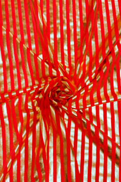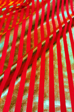 Ohut punainen lycra, johon on painettu kultaisia raitoja. Sopii hyvin esimerkiksi esiintymisasuihin ja jumppatrikoisiin.