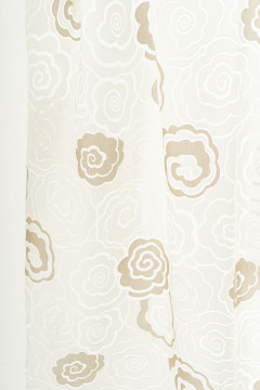 Kaunis kukallinen verhokangas, jossa kukat on luotu kuteeseen.