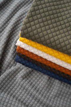 Pehmeä kohokuvioinen neuloskangas monipuoliseen vaatetus- ja asusteompeluun.