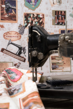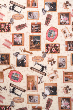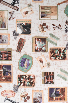Tuplaleveä puuvillapolyesteri, johon on painettu pastellinsävyinen käsityöaiheinen kuosi. Sopii hyvin erilaisiin sisustustekstiileihin.