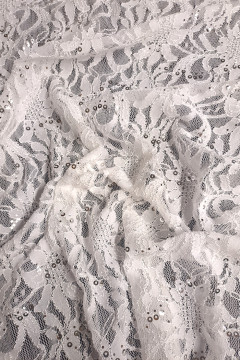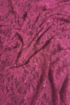 Joustava pitsikangas, johon pienet 2-5 mm halkaisijaltaan olevat paljetit tuovat juuri sopivasti kimallusta. Maidon värisessä pitsissä paljetit ovat hopeisia ja fuksian värisessä sävy sävyyn pitsin kanssa. Tämä kaunis joustopitsi sopii upeasti esimerkiksi juhlavaatteiden valmistukseen.