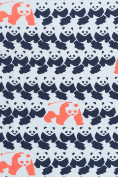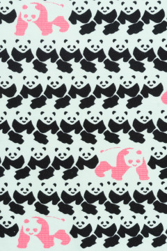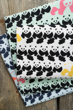 Puuvillatrikoo yksinkertaisella pandakuosilla, jossa seikkailee siellä täällä värillinen panda. Sopii hyvin monenlaiseen tarkoitukseen, esimerkiksi paitoihin, legginseihin, mekkoihin ja tunikoihin, sekä pipoihin ja pantoihin.