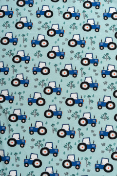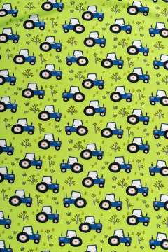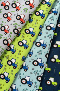 Puuvillatrikoo traktorikuosilla. Sopii hyvin monenlaiseen tarkoitukseen, esimerkiksi paitoihin, legginseihin, mekkoihin ja tunikoihin, sekä pipoihin ja pantoihin.