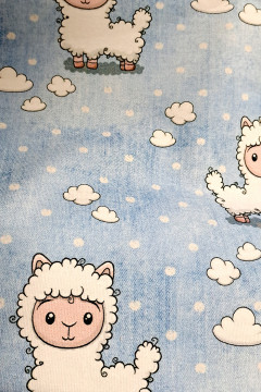 Suloinen college lammaskuosilla, jonka tausta muistuttaa väritykseltään farkkua. Sopii hyvin esimerkiksi paitoihin, housuihin, haalareihin, tunikoihin sekä huppareihin.