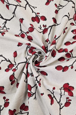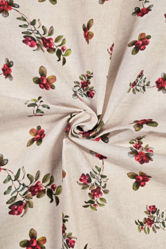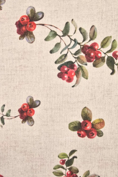 Luonnonvalkoiselle puuvillalle on painettu hieman eläväinen natural -sävyinen pohja ja puolukanvarpuja. Tämä hieman lakanaa vahvempi puuvillakangas soveltuu hyvin materiaaliksi mm. essuihin, patalappuihin, liinoihin ja kangaskasseihin tai vaikkapa kausiverhojen valmistukseen.