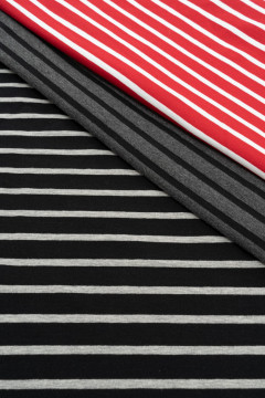 Raidallinen puuvillatrikoo. Sopii hyvin monenlaiseen tarkoitukseen, esimerkiksi paitoihin, legginseihin, mekkoihin ja tunikoihin, sekä pipoihin ja pantoihin.
