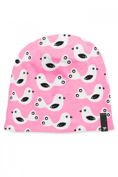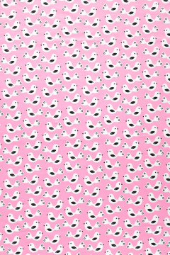 Suloisen vaaleanpunainen puuvillatrikoo mustavalkoisella lintukuosilla. Sopii hyvin monenlaiseen tarkoitukseen, esimerkiksi paitoihin, legginseihin, mekkoihin ja tunikoihin, sekä pipoihin ja pantoihin.