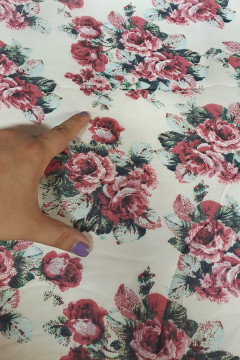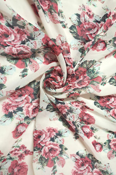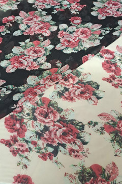 Kevyt läpikuultava kukallinen polyesterisifonki, joka sopii hyvin vaatetukseen, kuten paitoihin, ja mekkoihin.