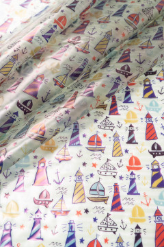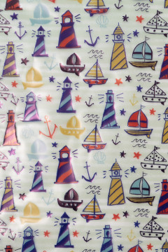 Läpinäkyvä sadetakkikangas, jonka merellisessä kuosissa on muun muassa majakoita ja purjeveneitä. Sopii sadetakkeihin, -viittoihin ja -housuihin, sekä esimerkiksi reppujen ja laukkujen sadesuojuksiin.