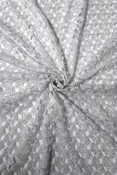 Hopeinen kauniin hohtava pitsikangas, joka sopii hyvin esimerkiksi juhla- ja esiintymisasuihin.