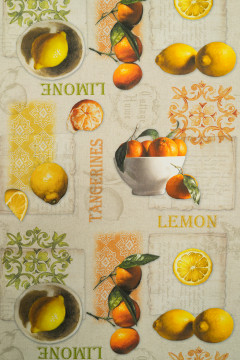 Harmoninen, välimerellinen sitrushedelmäkuosi painettuna sanforoidulle puuvillakankaalle. Sopii hyvin kodintekstiileihin, kuten verhoihin, liinoihin, essuihin.