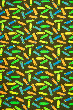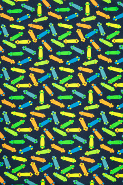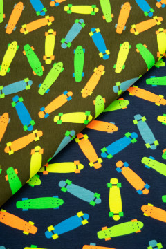 Puuvillatrikoo värikkäällä skeittilautakuosilla. Sopii hyvin monenlaiseen tarkoitukseen, esimerkiksi paitoihin, legginseihin, mekkoihin ja tunikoihin, sekä pipoihin ja pantoihin.