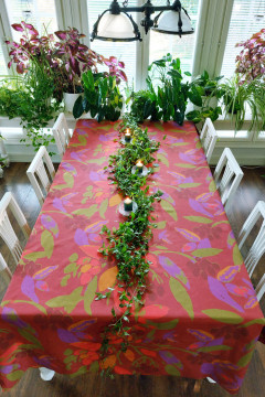 Syyspuutarha on Merja Palinin suunnittelema kuosi, jonka värit hehkuvat upeasti puuvillalle painettuna. Todella monipuolinen kangas, joka sopii mm. verhoihin, kangaskasseihin, essuihin, koristetyynyihin, patakintaisiin ja moneen muuhun käyttöön.