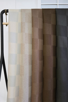 Kauniiseen ruutukuosiin kudottu dimout -pimennysverhokangas, jonka nurjapuoli on sileä ja samaa sävymaailmaa oikean puolen kanssa. Yhden ruudun halkaisija on noin 13cm. Dimoutkangas hämärtää tilan huomattavasti tavallista verhokangasta paremmin.