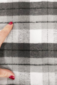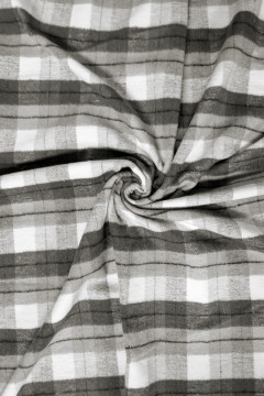 Pehmeä, valkoharmaasävyinen puuvillaflanelli sopii hyvin monipuoliseen vaatteiden, asusteiden ja vaikkapa torkkupeittojen valmistukseen. Kangas on kierrätyslaatuista, lankavärjättyä ja pinta molemmin puolin pehmeäksi harjattua.