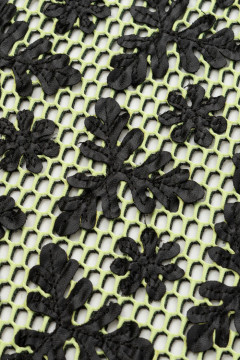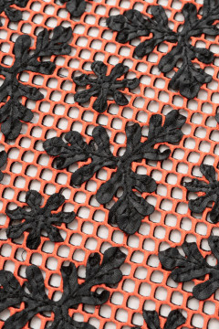 Paksuhko verkkokangas, jossa on kaksi verkkoa päällekkäin niin, että nurjalla puolella oleva verkko on musta. Kangas on koristeltu ompelemalla siihen keinonahkaisia kuvioita, joista pienemmän halkaisija on noin 3cm.