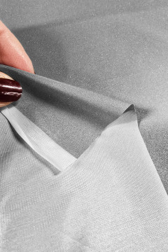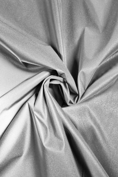 Hopean sävyinen ja hyvin heijastavalla materiaalilla pinnoitettu kudottu kangas.