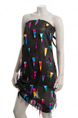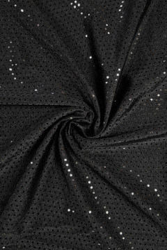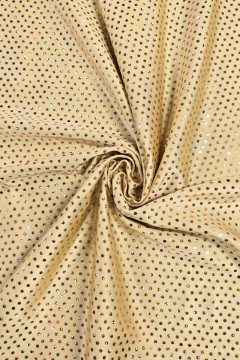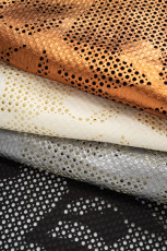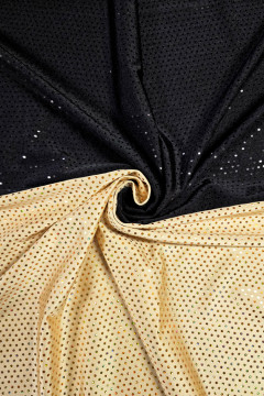 Hieman kiiltävän lycran pinta on täynnä 3mm halkaisijan metallinhohtoisia liimapaljetteja. Paljetit ovat mustalla pohjalla mustia ja nudella pohjalla hologram -pintaisia kullansävyisiä. Sopii hyvin mm. esiintymisasujen valmistukseen tai vaikkapa tapahtumien ja kuvauspaikkojen ripustuksiin.